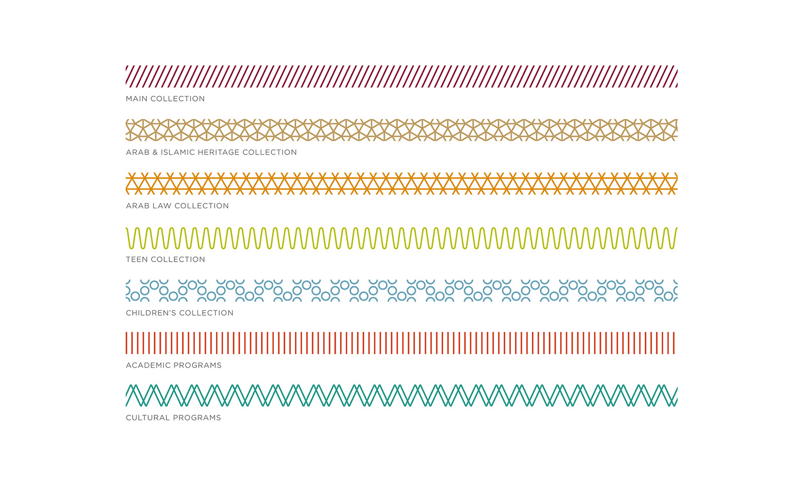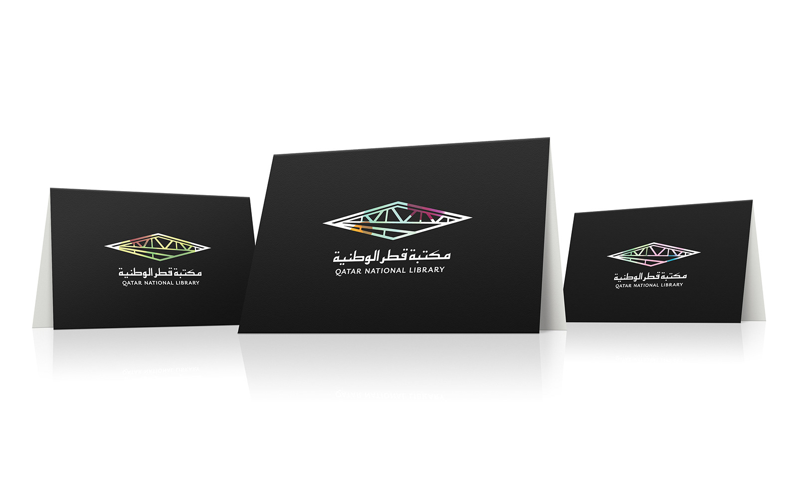 Brand identity, guidelines, stationery, and patterns for a national library in Doha, Qatar. The identity combines the idea of place (building and architecture) with a visual expression of knowledge (free flowing and colorful).